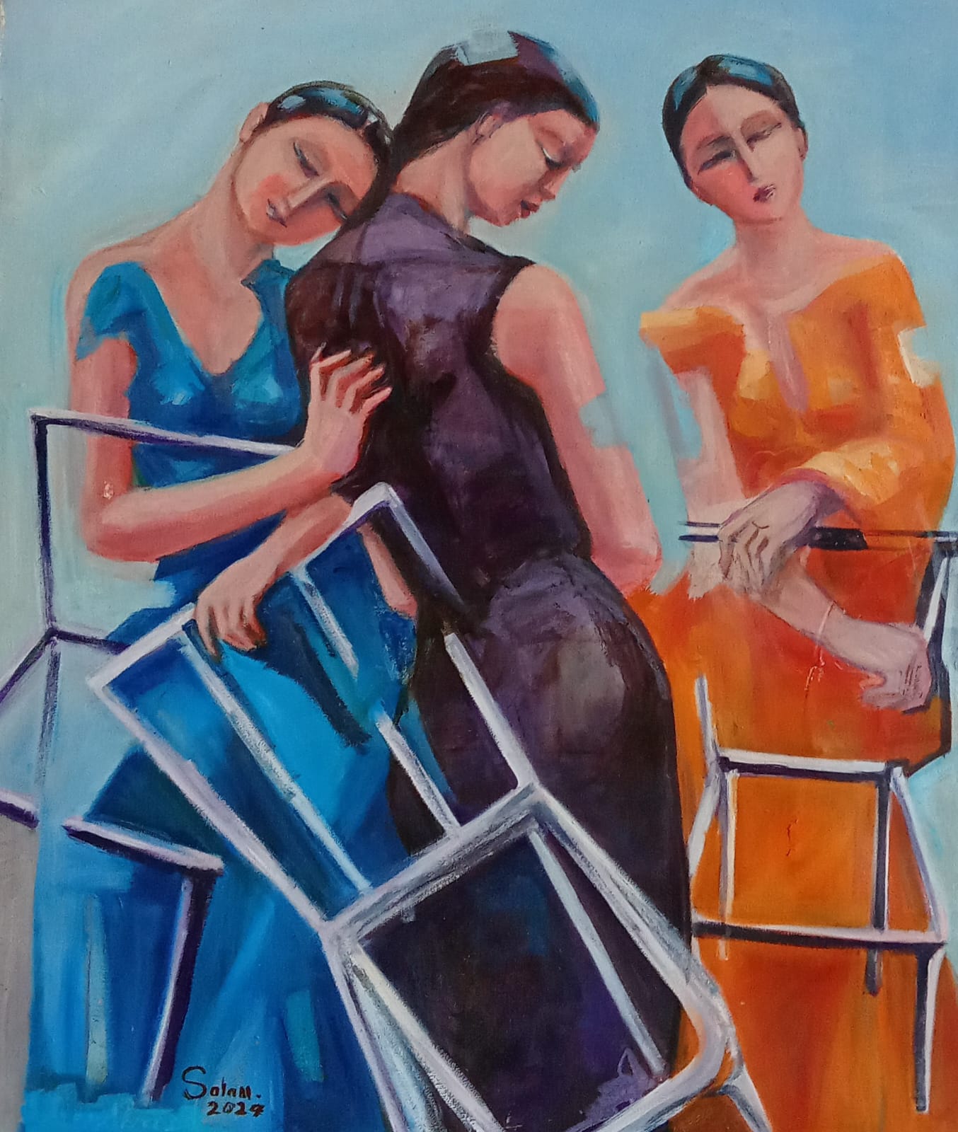 Salam Ahmad, trained in Fine Arts in Syria, works through painting as an intimate, emotional language. Her compositions emerge from quiet inner spaces, where feelings take form before they are spoken. The body dissolves into sensation, and color, especially grey, becomes a field of reflection, suspended between presence and absence, fullness and emptiness.