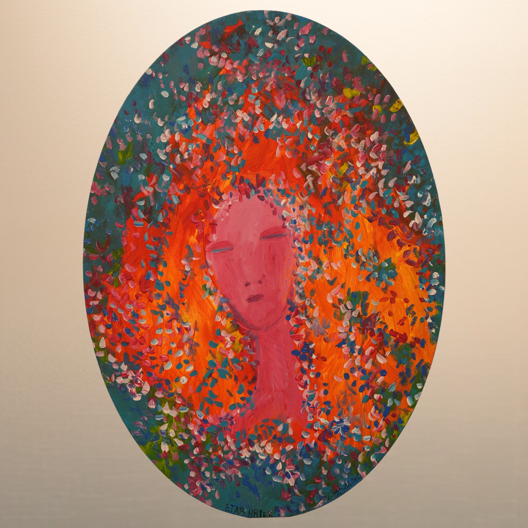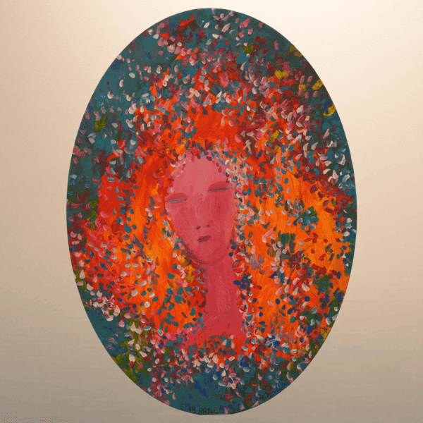 A face emerges from a storm of petals and color serene, unspoken, alive. The woman seems both part of the earth and apart from it, her hair dissolving into blossoms that echo the rhythm of nature itself. Hreib paints inner stillness as something blooming — the quiet beauty of a soul in harmony with its own fire.