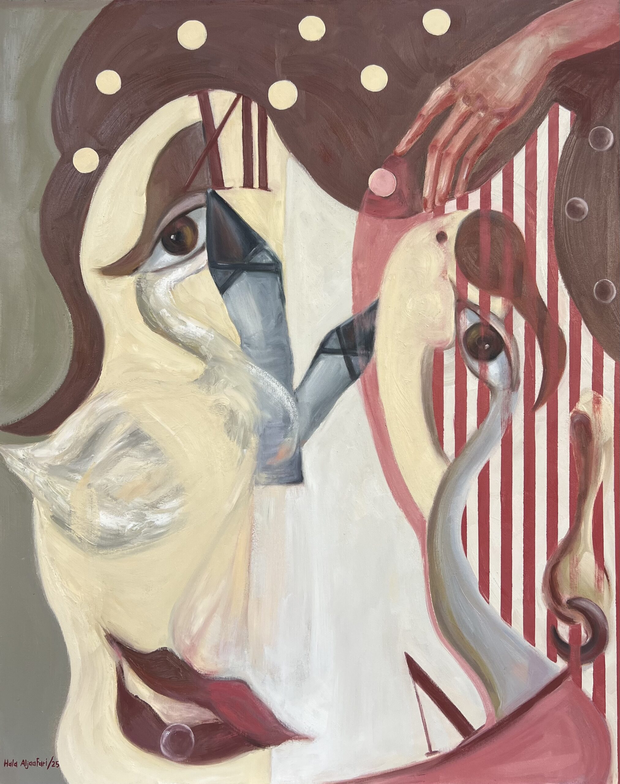 Born in Damascus in 1988 and based in Doha, Hala Aljaafari’s work explores the emotional tension between inner and outer realities. Her introspective paintings capture suspended moments filled with longing, memory, and quiet transformation. Through layered brushwork, she evokes the silent weight of time and the depth of human experience.